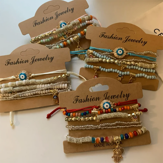 6 Styles! Multilayer Elastic Beaded Strand Bracelets Set For Women Evil Eye Beads Combination Handmade Bracelet