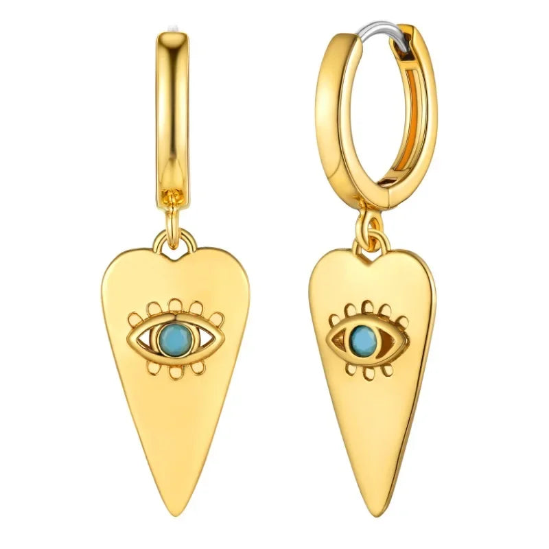 These are drop earrings made of copper, featuring an elongated heart design with an evil eye dangle. The metal used is gold plated copper and they are suitable for women and girls.