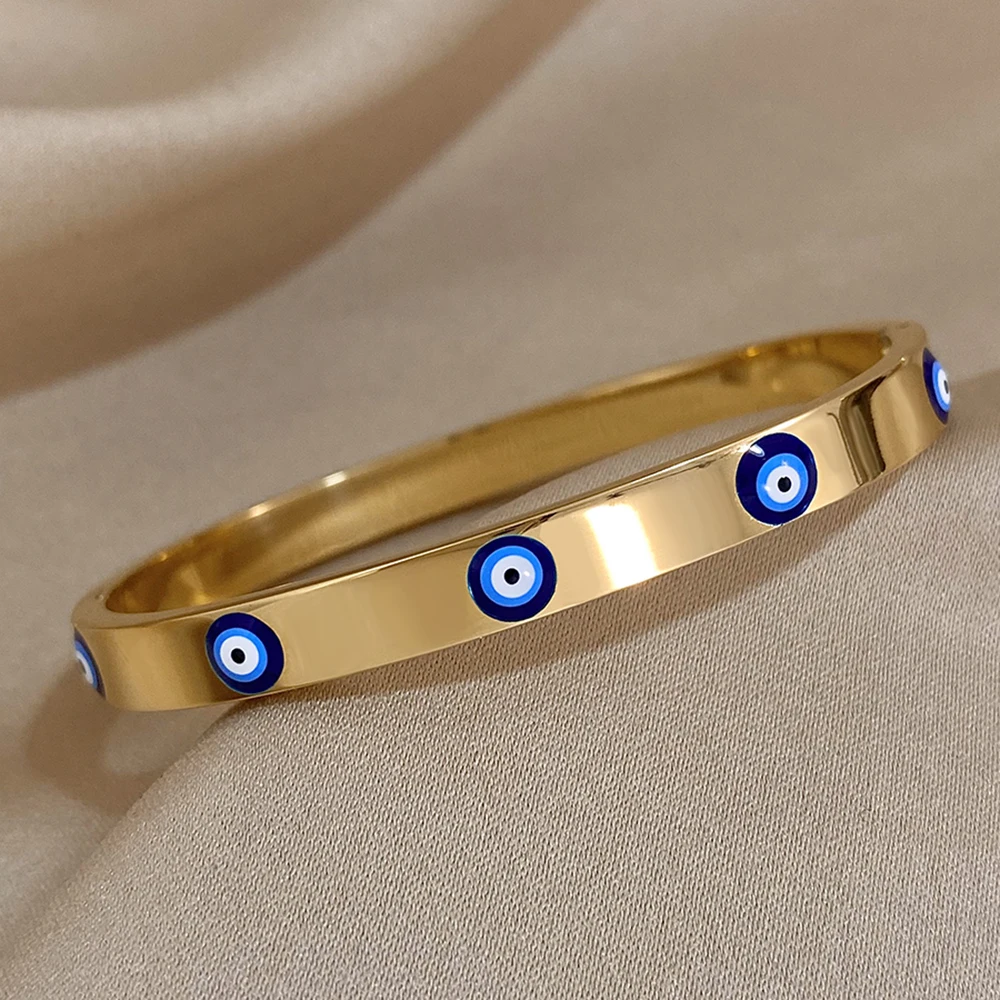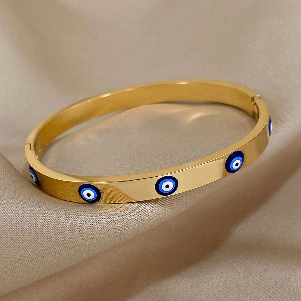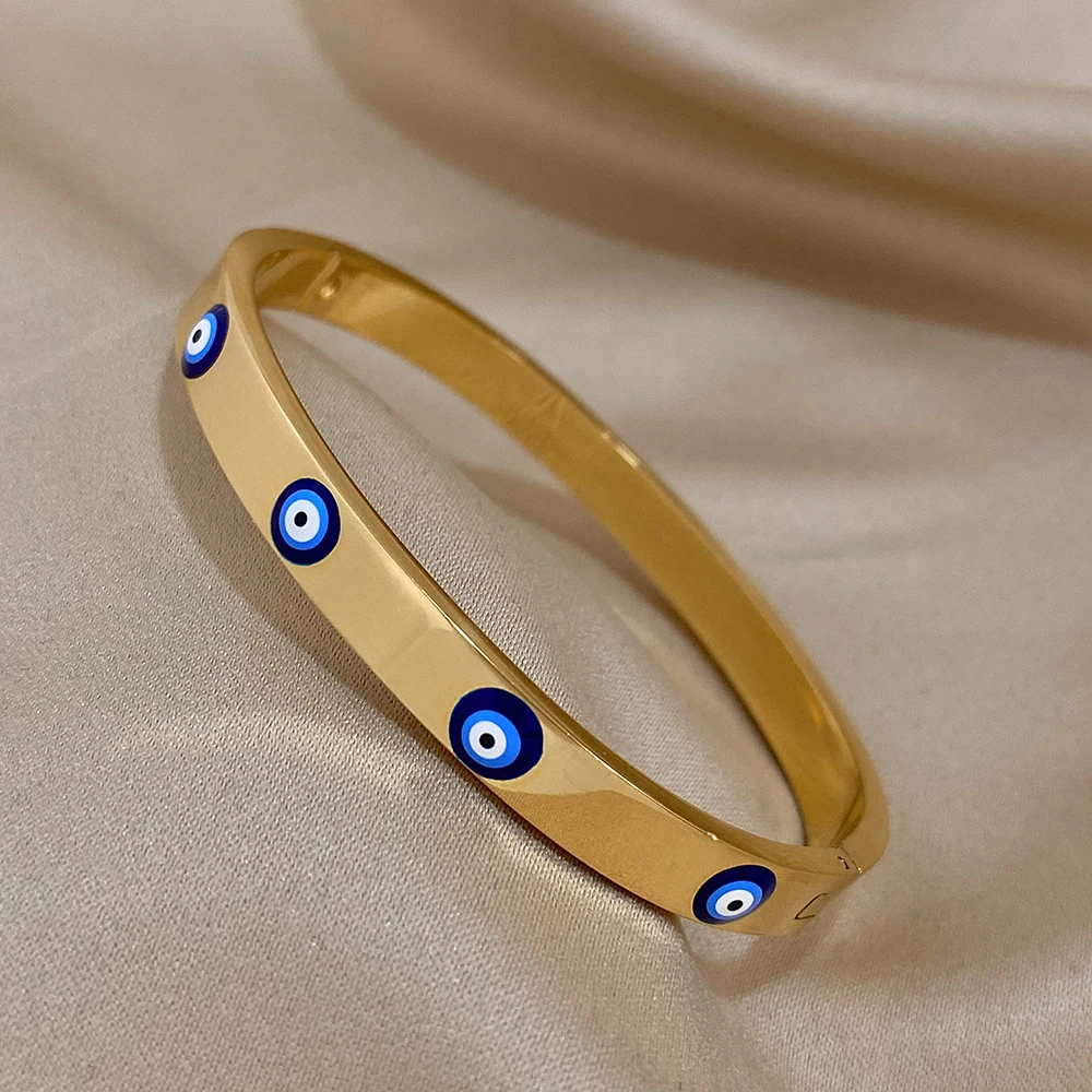 Item: DODOHAO Boho Blue Enmale Evil Eye Stainless Steel Bangles Bracelets for Women Charm Simple Lucky Gold Plated Thin Chain Fasion Jewelry Gift