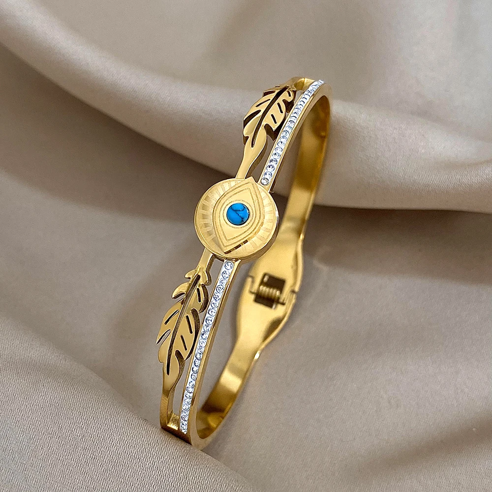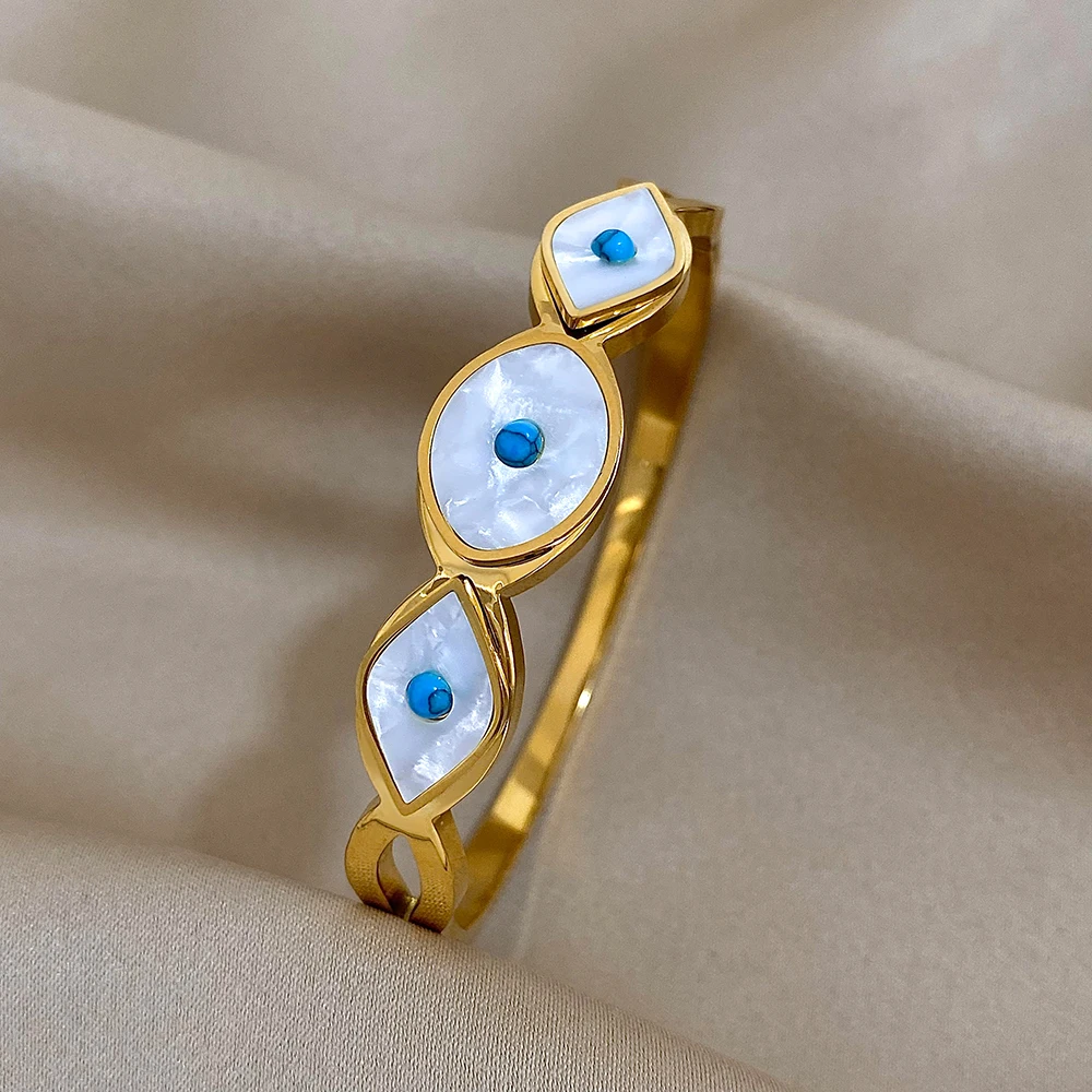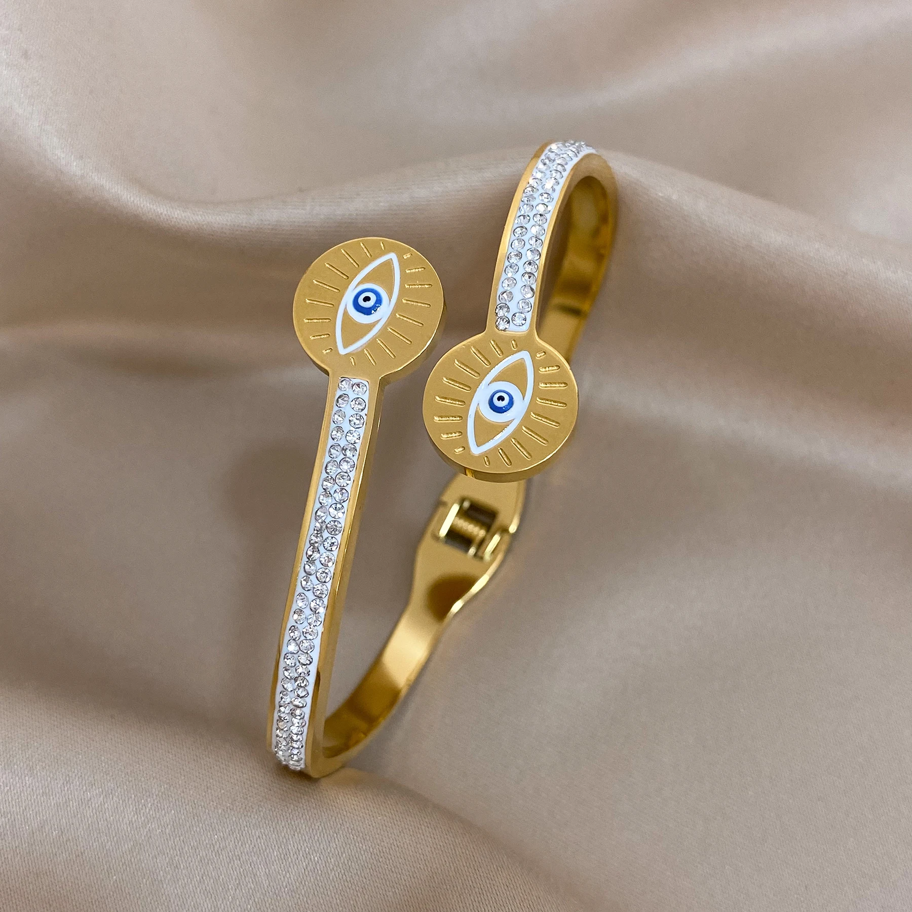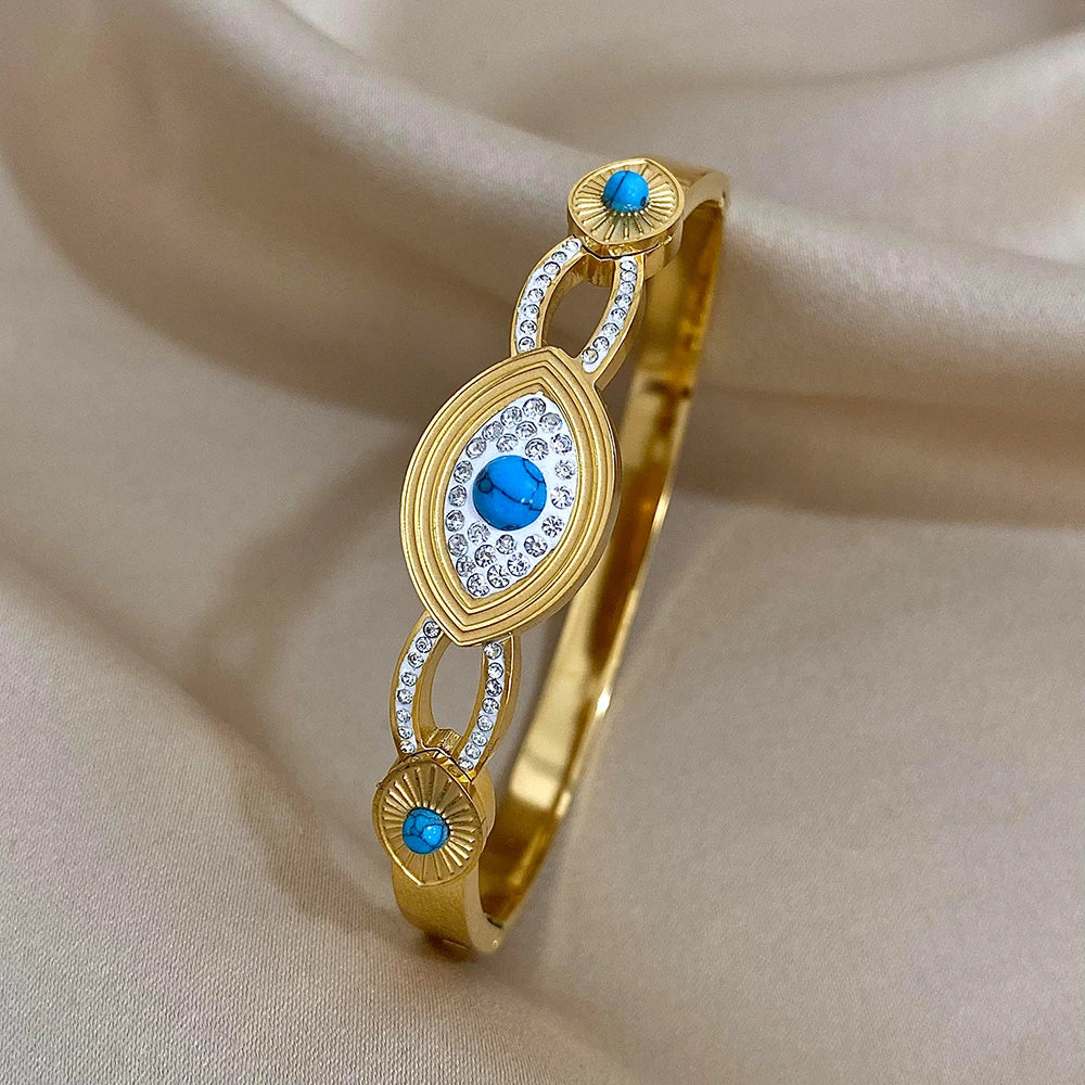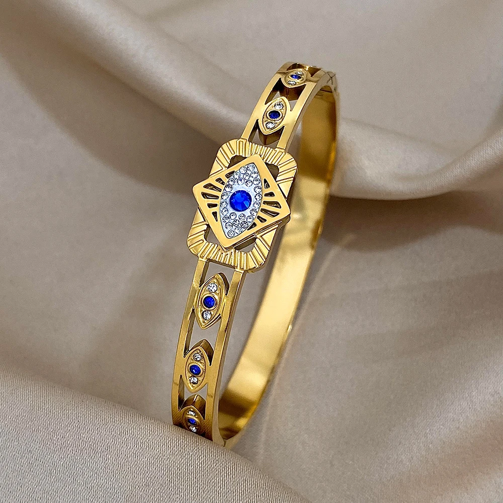 FLASHBUY Boho Evil Eye Stainless Steel Bangles Bracelets for Women Enamel Rhinestones Gold Plated Waterproof Fasion Jewelry Gift