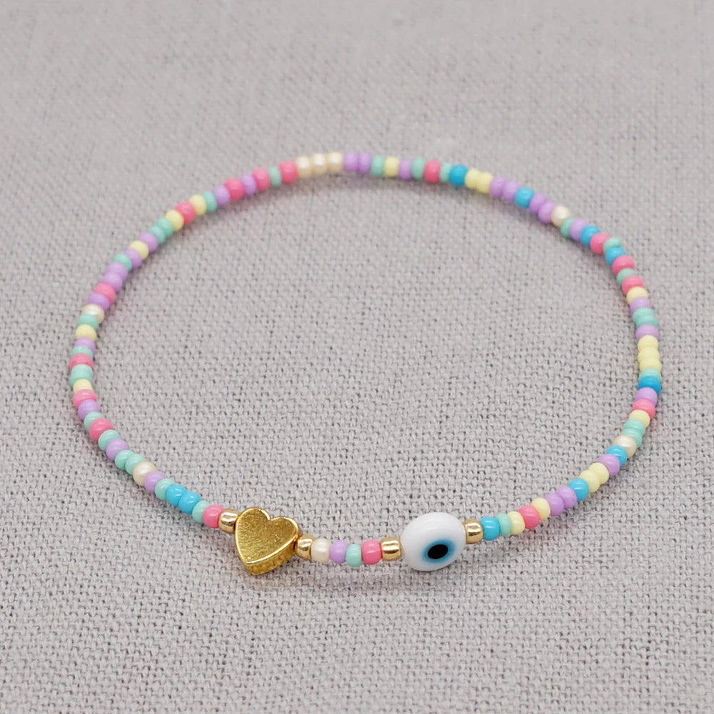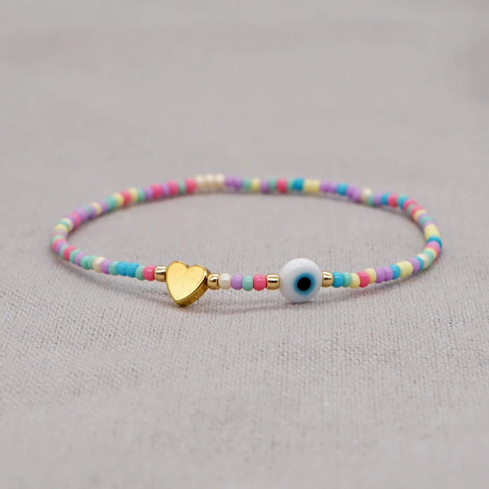 Kid's Rainbow Bead Bracelet Evil Eye Heart Jewelry Golden Heart White Glazed Evil Eye Colorful