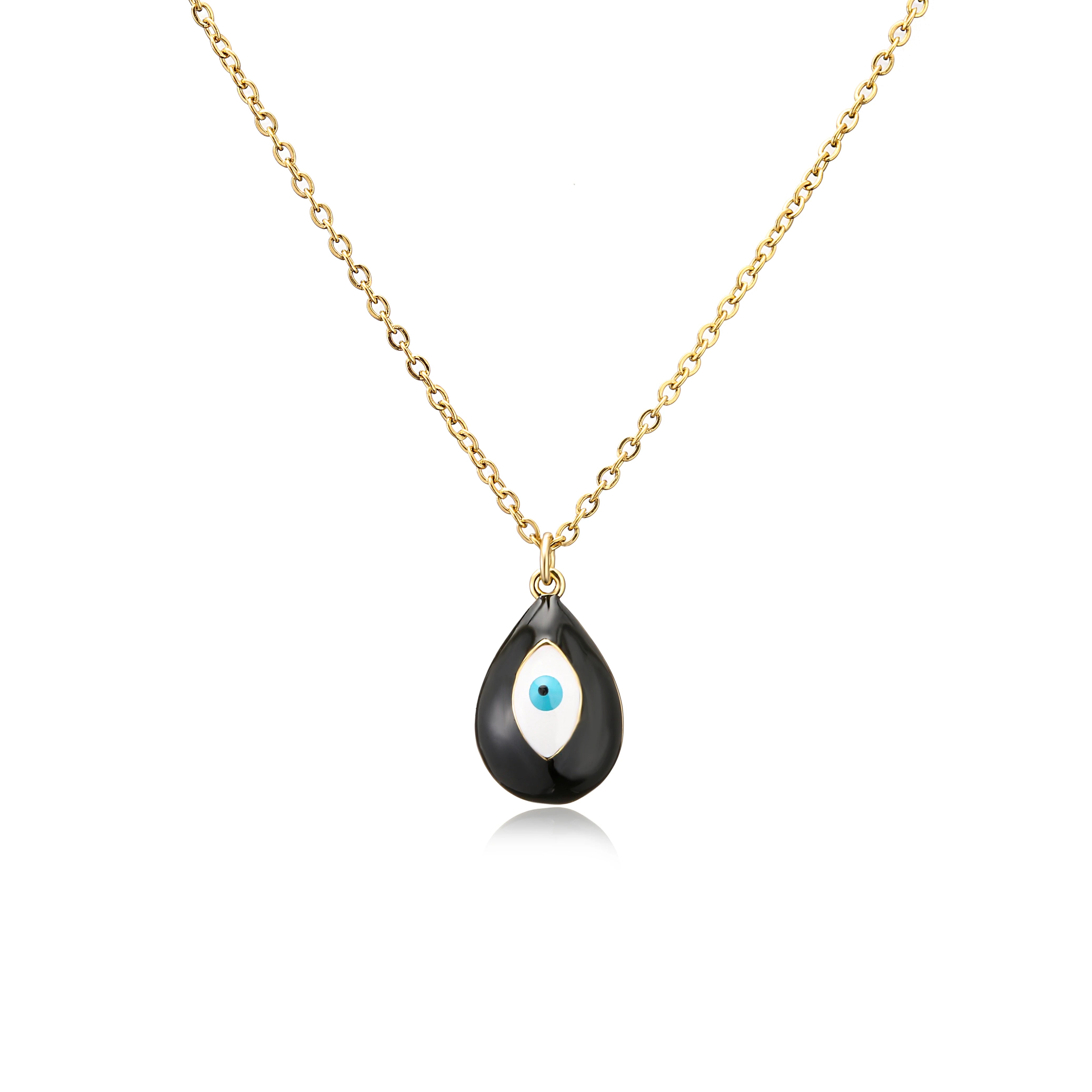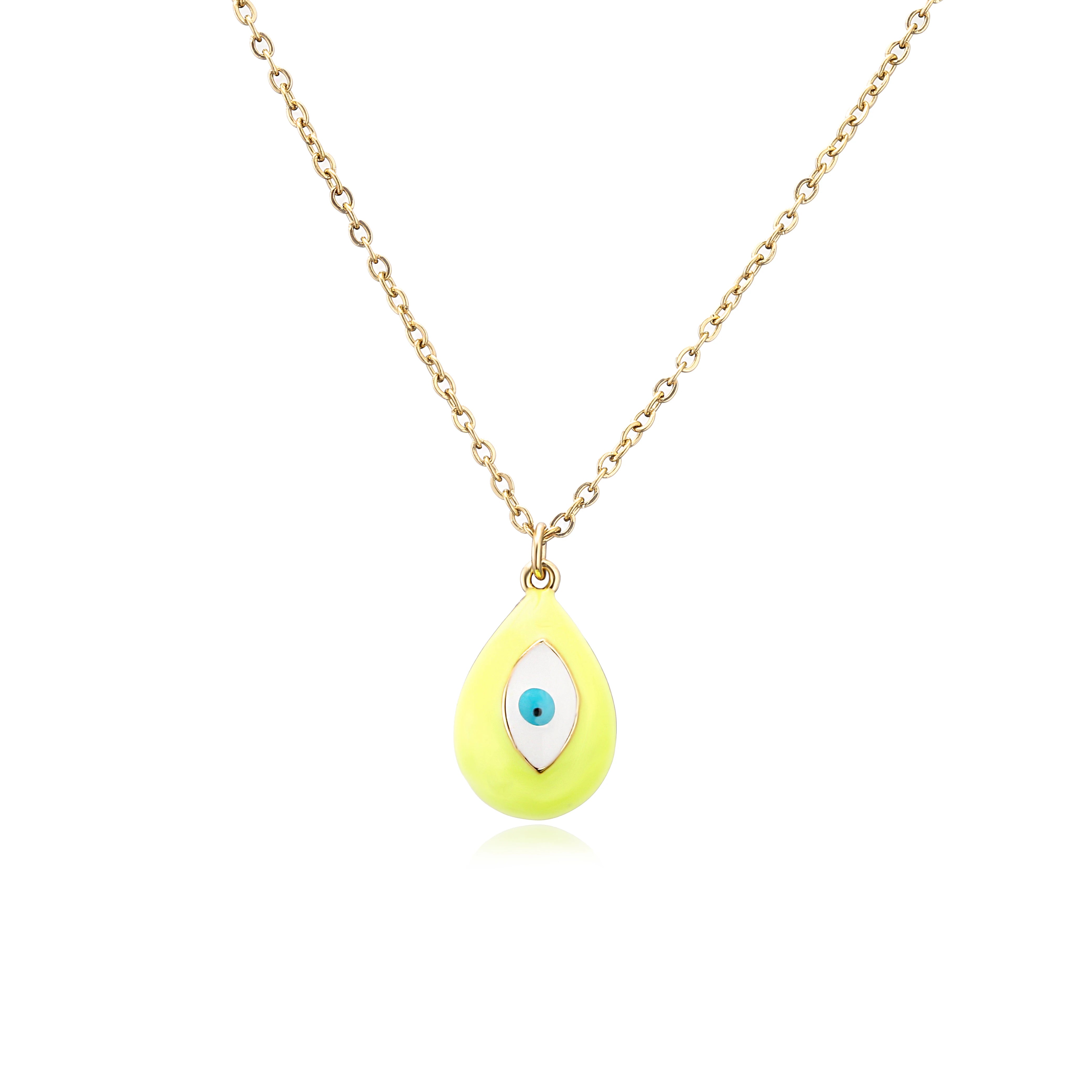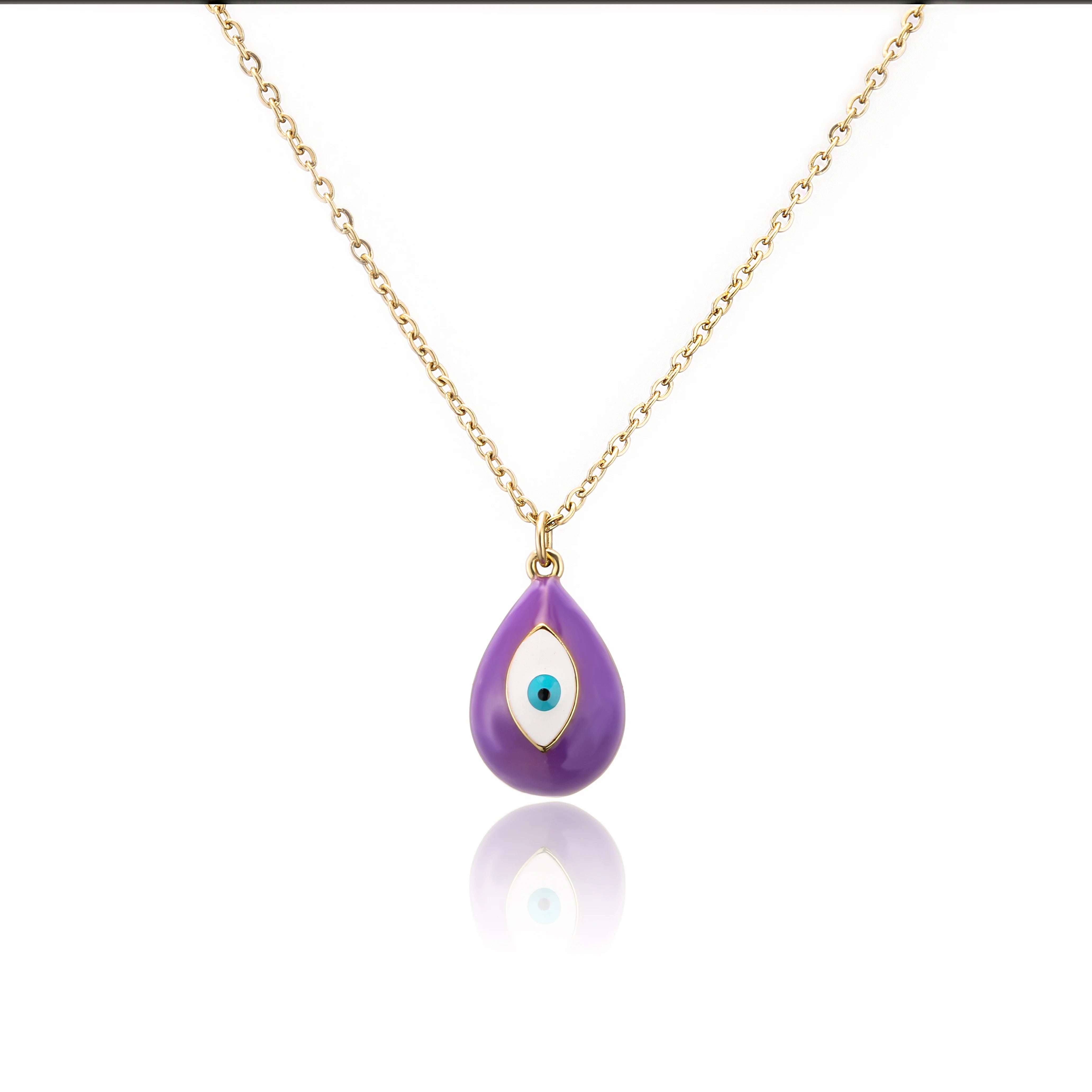 This pendant necklace is available in 10 vibrant colors, featuring a striking "water drop" shape with evil eye detailing. It is made of copper and hangs on an O-chain, making it a unique and eye-catching addition to any jewelry collection. Pendant Measures 1.2 cm x 1 cm and the Chain measures 45 cm long.