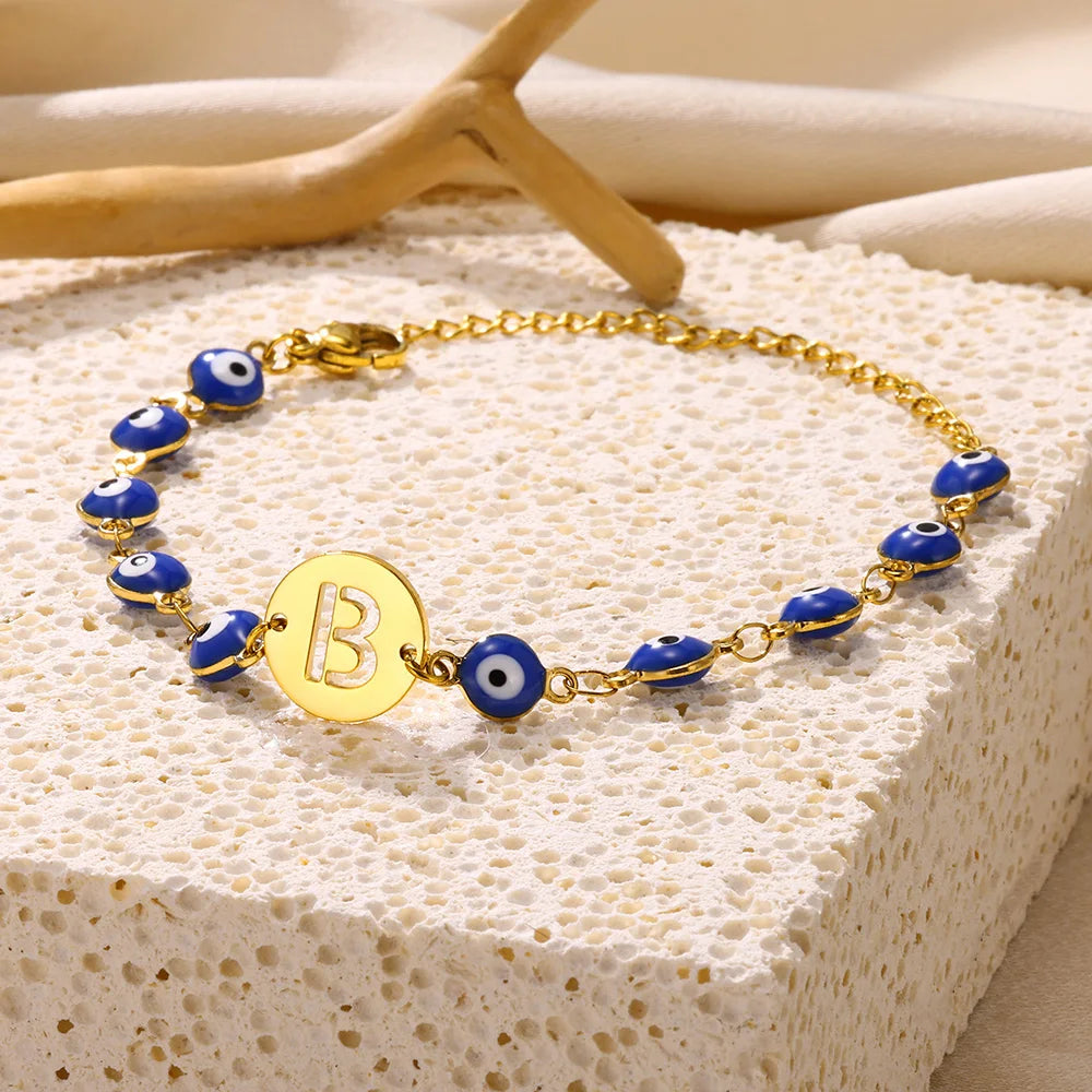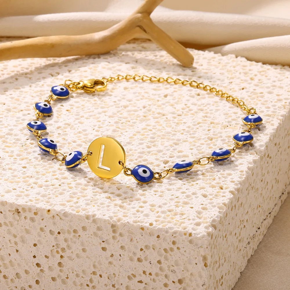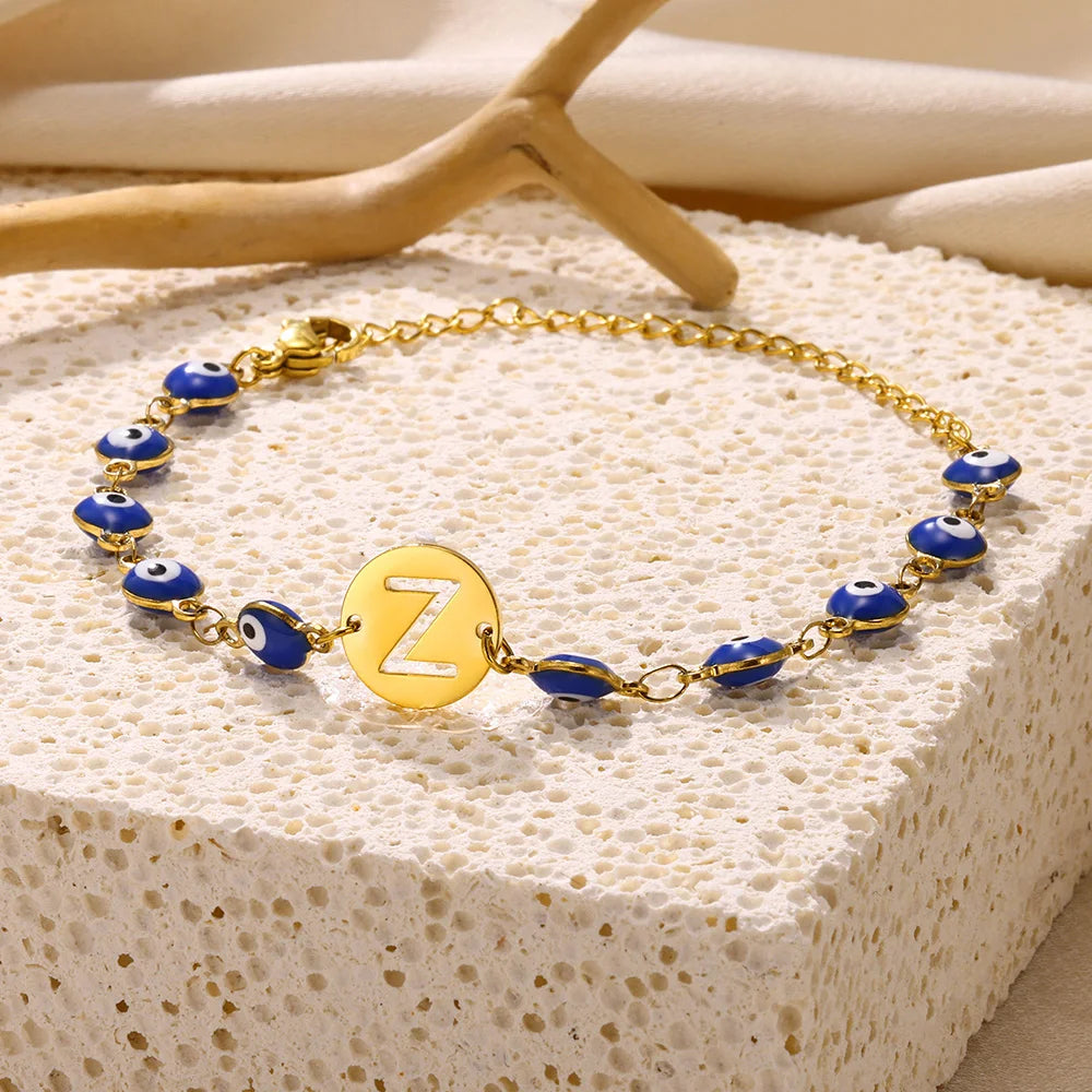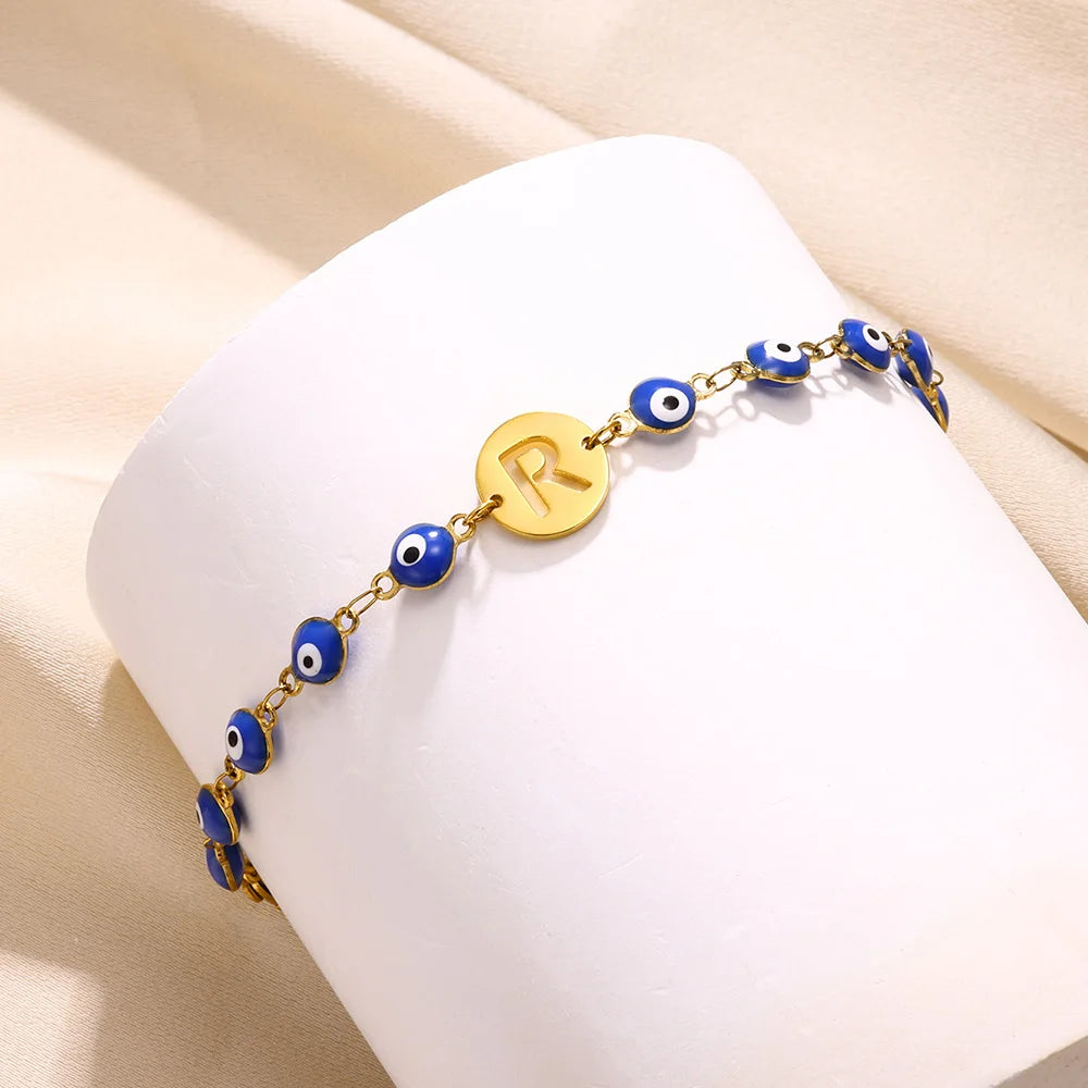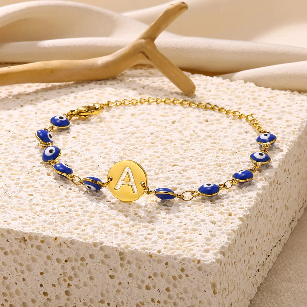 Choose your custom Initial! This product is a Custom Letter Name Initial Lucky Protective Blue Eye Letters Bracelets For Women Girl Amulet Jewelry. It is made of Stainless Steel, and is finished with 18K gold plating. The shape is Round and the type is Chain & Link Bracelets with a Lobster-claw-clasp. The model number is Evil Eye Bracelet.