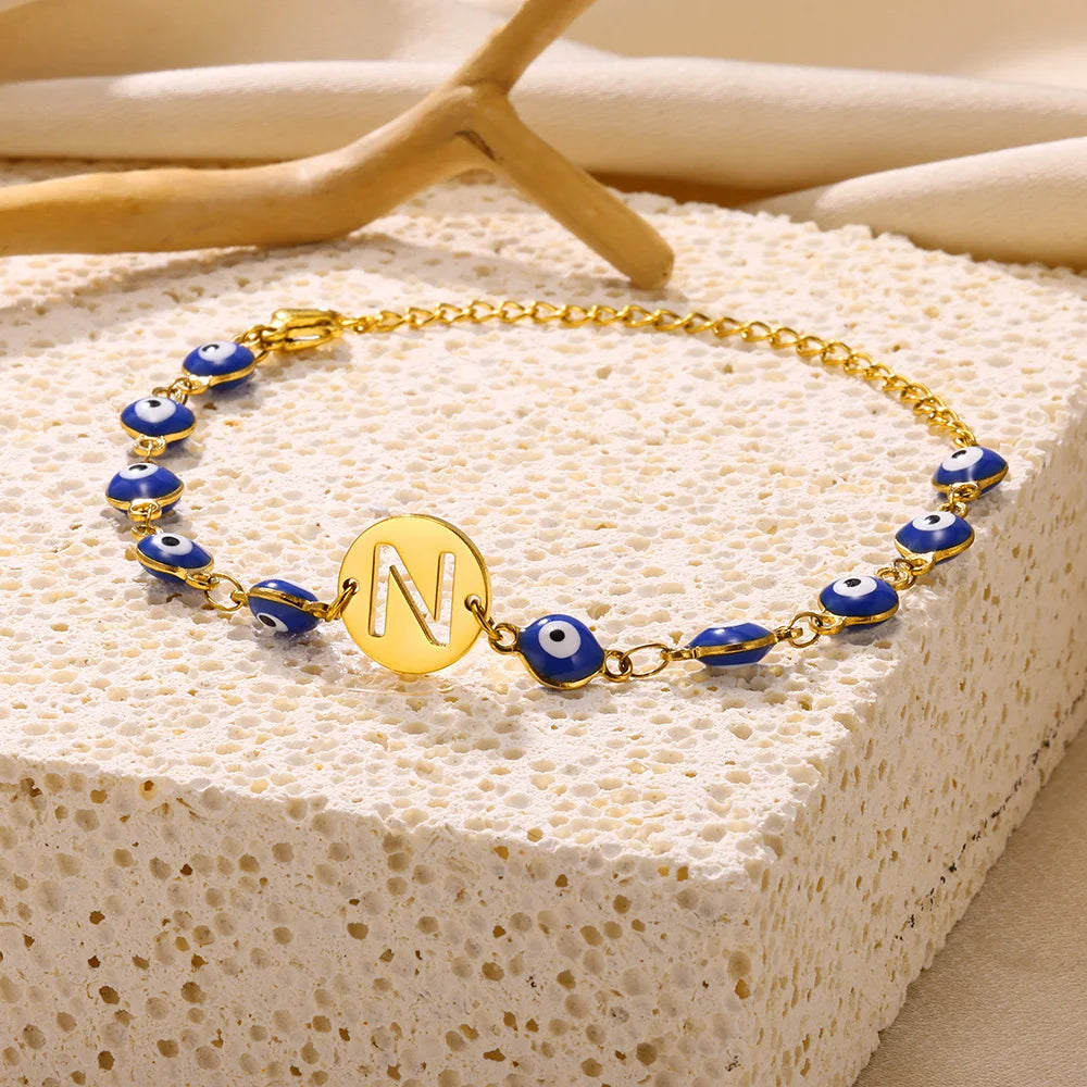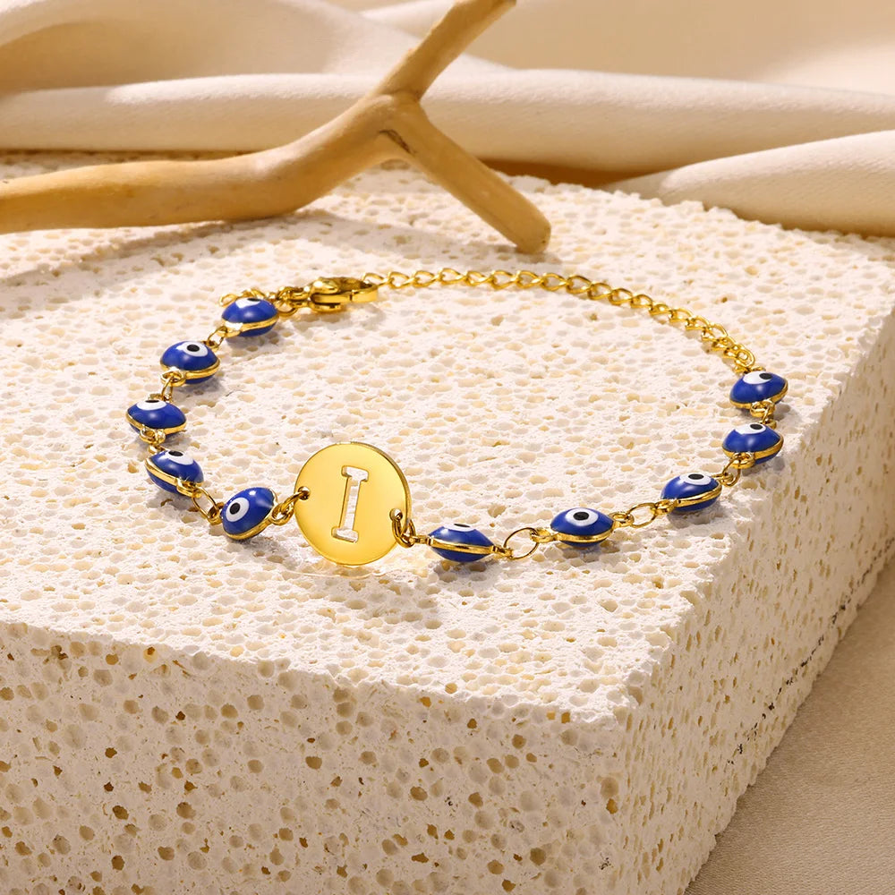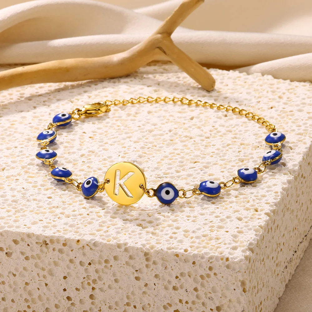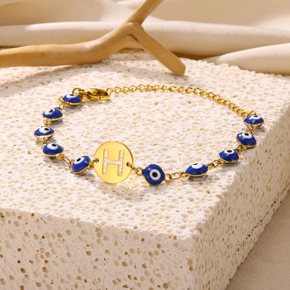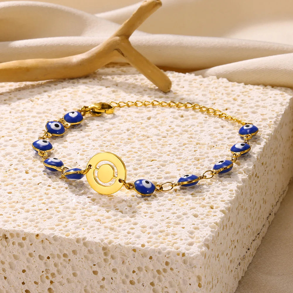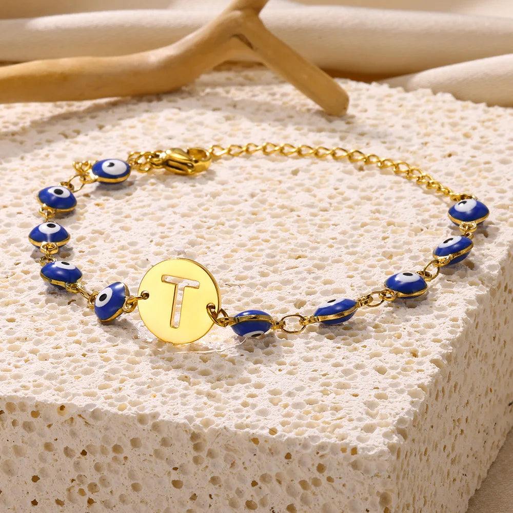 Choose your custom Initial! This product is a Custom Letter Name Initial Lucky Protective Blue Eye Letters Bracelets For Women Girl Amulet Jewelry. It is made of Stainless Steel, and is finished with 18K gold plating. The shape is Round and the type is Chain & Link Bracelets with a Lobster-claw-clasp. The model number is Evil Eye Bracelet.