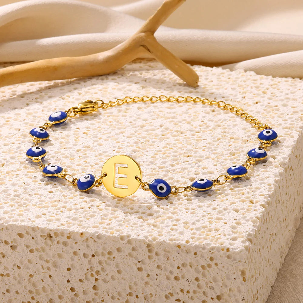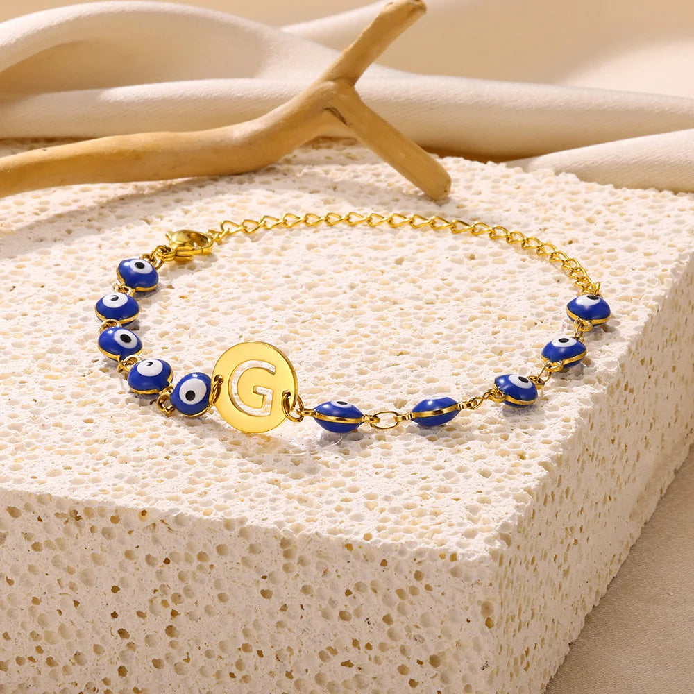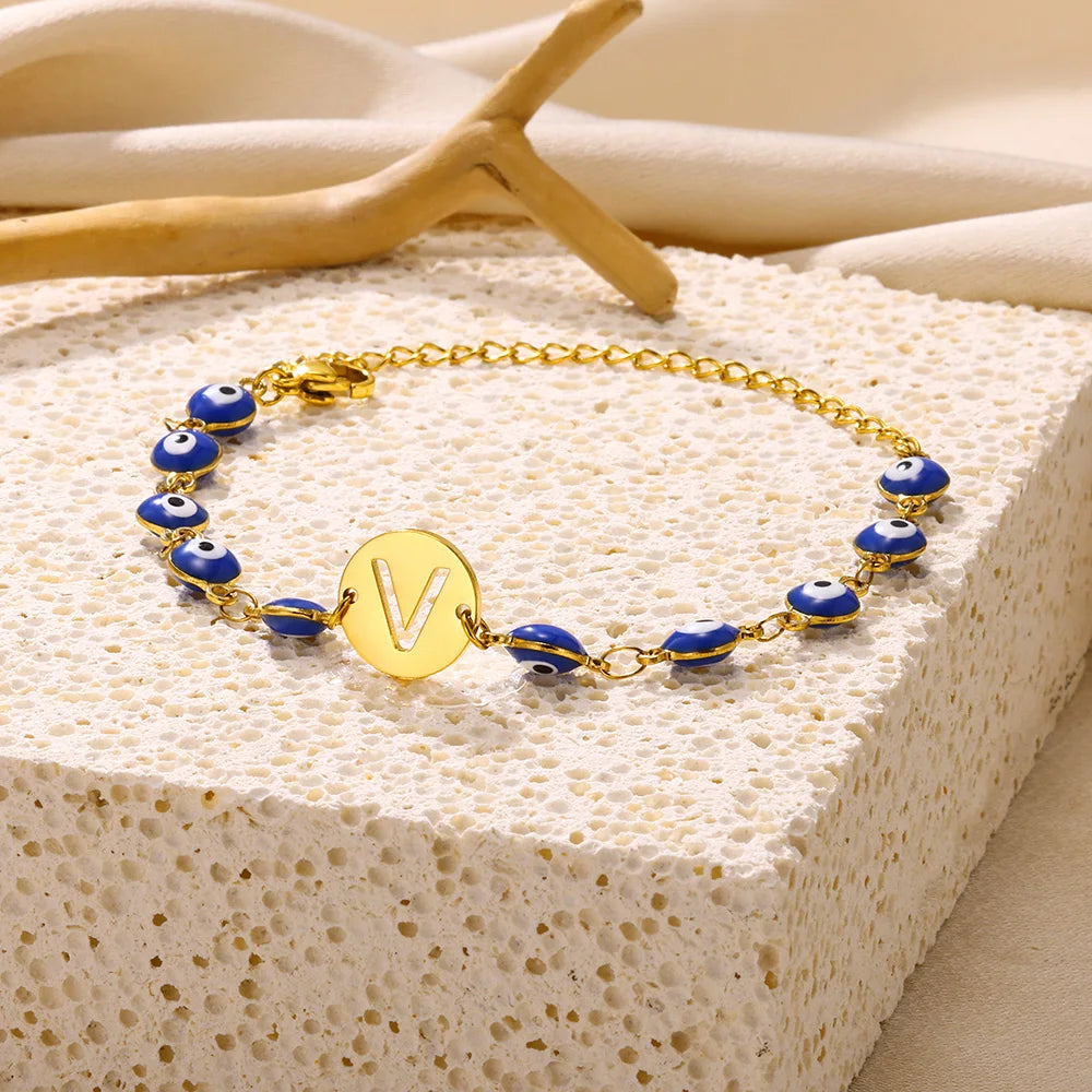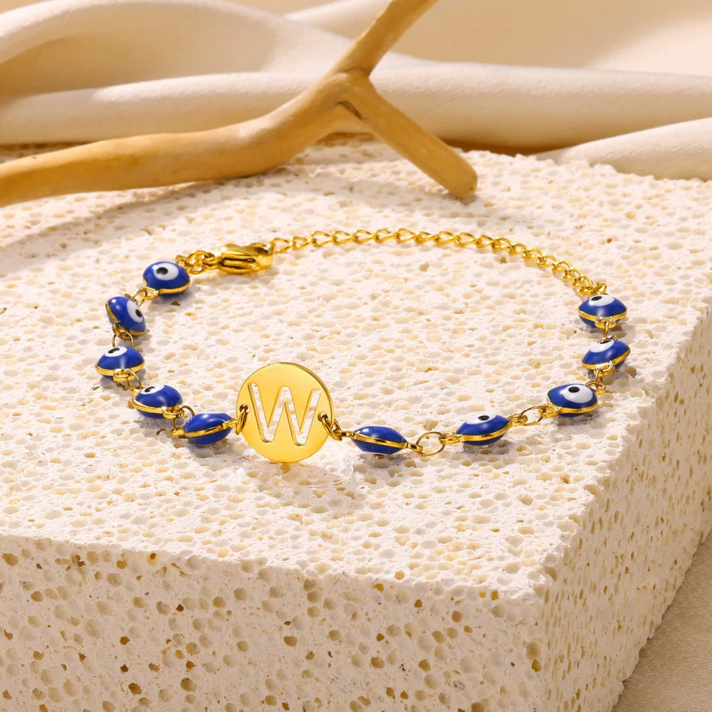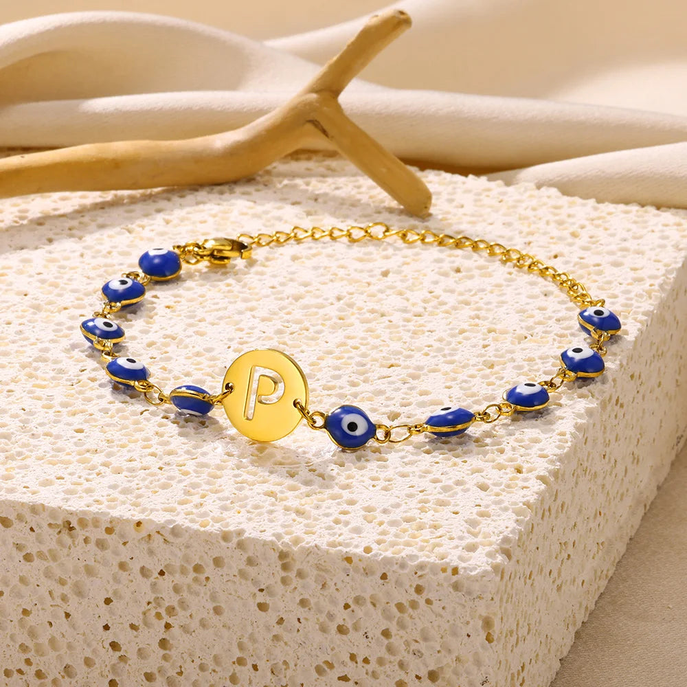Choose your custom Initial! This product is a Custom Letter Name Initial Lucky Protective Blue Eye Letters Bracelets For Women Girl Amulet Jewelry. It is made of Stainless Steel, and is finished with 18K gold plating. The shape is Round and the type is Chain & Link Bracelets with a Lobster-claw-clasp. The model number is Evil Eye Bracelet.