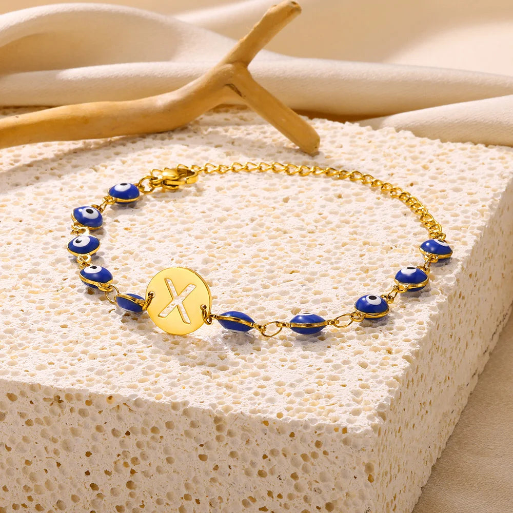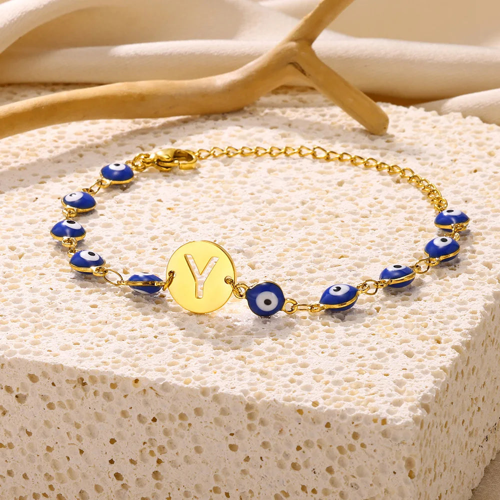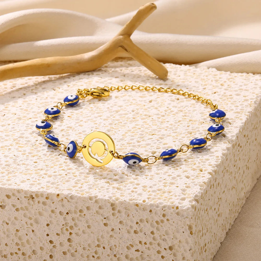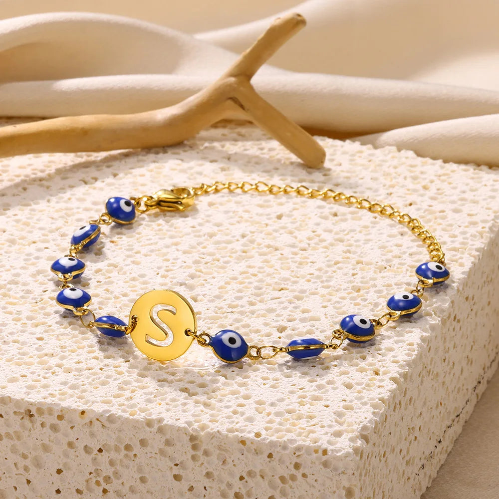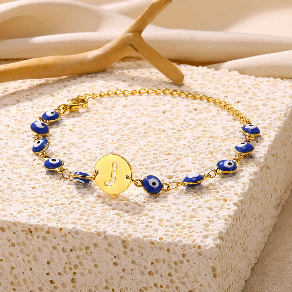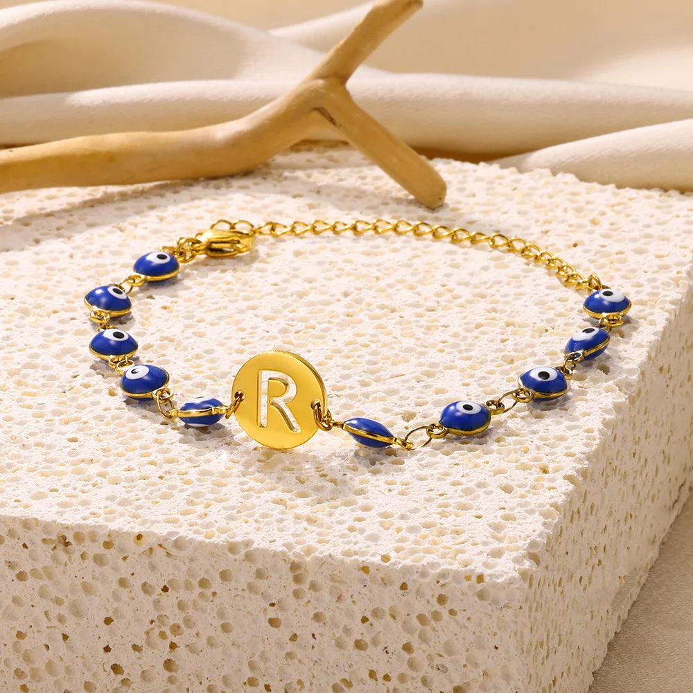 Choose your custom Initial! This product is a Custom Letter Name Initial Lucky Protective Blue Eye Letters Bracelets For Women Girl Amulet Jewelry. It is made of Stainless Steel, and is finished with 18K gold plating. The shape is Round and the type is Chain & Link Bracelets with a Lobster-claw-clasp. The model number is Evil Eye Bracelet.