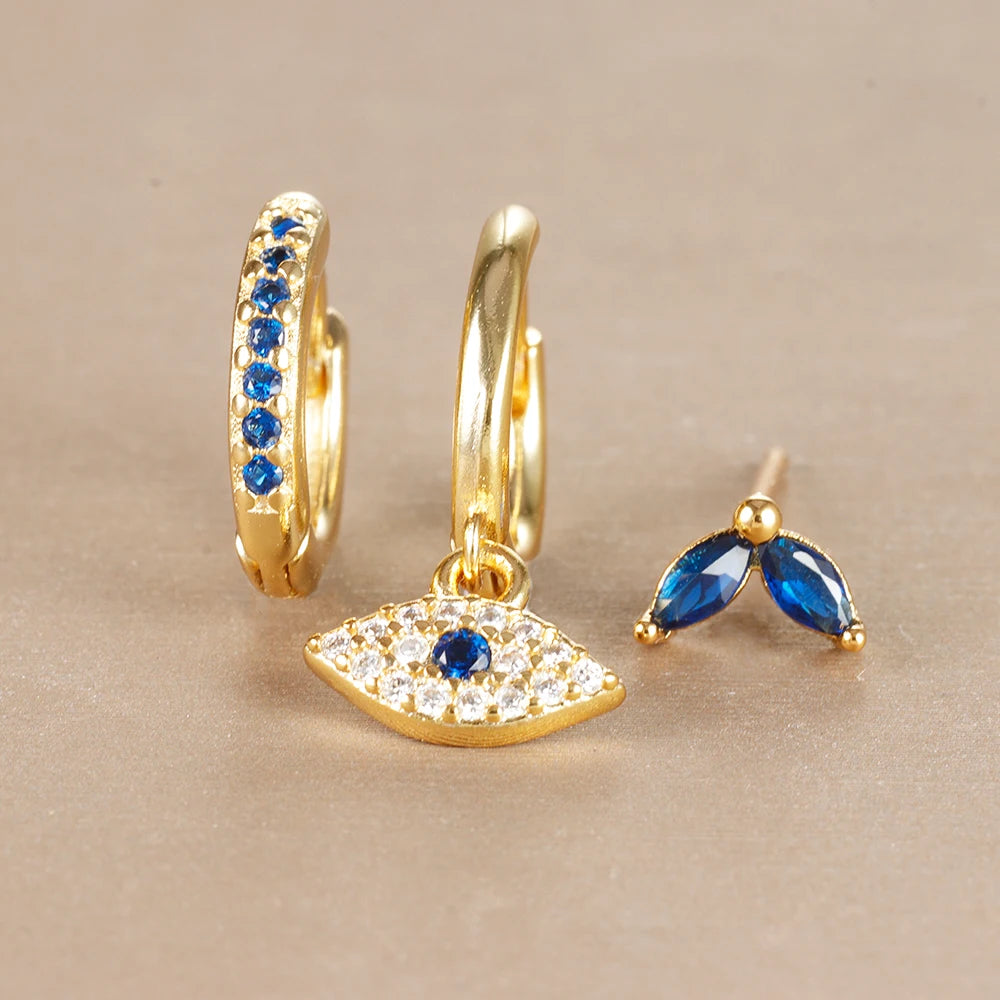3 Piece Set! Luxury Zircon Evil Eye Hoop Stud Earring Set For Women Gold and Blue
