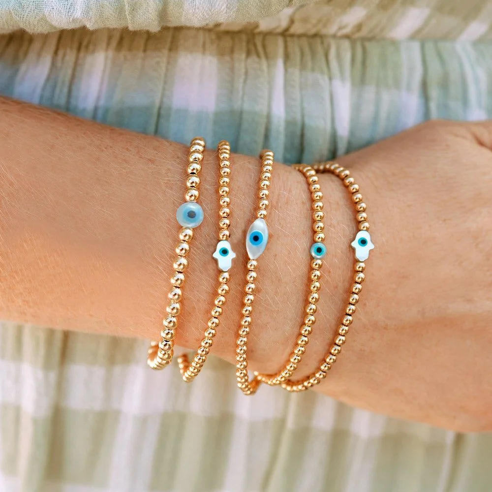 Vlen Lucky Evil Eye Bracelets Hamsa Hand Bracelet for Women 18 K Gold Plated Ball Beads Stretch Pulseras Protective Jewelry